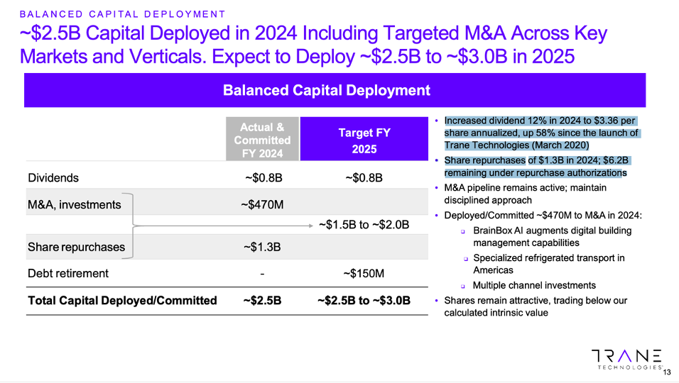 In 2024 Trane increased the dividend 12% and allocated $2.5 billion of total capital ($470 million to M&A, $760 million to dividends, and $1.3 billion to share repurchases). For reference, in 2023 Trane deployed $2.4 billion ($900 million to M&A, $684 million to the divi, and $750 million to share buybacks). Trane is committed to consistently reinvesting into the business (see quotes below) and to returning 100% of FCF to investors over time through a growing dividend and share repurchases.