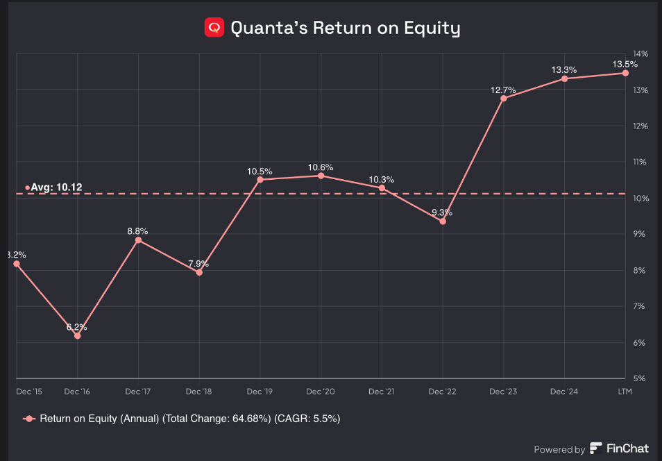 Quanta generated a return on equity (ROE) of 13.5%, which is above its five-year (2020 – 2024) average ROE of 11% and above its 2015 to 2018 average ROE of less than 8%. This is a step-function shift in Quanta’s return-profile in the last decade. In the second image below, you can see that in the last decade Quanta has had three distinct phases of returns…the first when ROEs were around 7%-8%, then a middle phase when ROE was around 10%, and now this latest phase shift with its ROE above 13%, and rising.