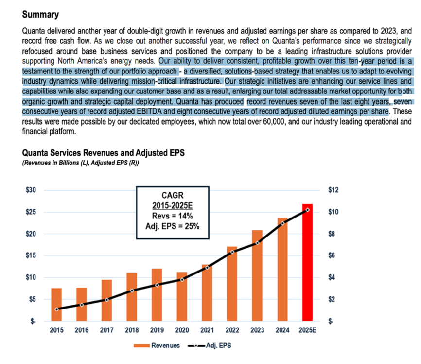 Quanta’s (NYSE: PWR) business is performing very well. Its Q1:2025 revenue increased nearly 24% and its adjusted EPS grew 26% from the same period in the prior year. Its backlog grew to $35.3 billion. The impressive thing about Quanta’s EPS growth is that it has been able to sustain this level of growth for a decade (see first screenshot below from its Q4:2024 management commentary). Not bad for an “electrical contractor” (more on this in a moment).