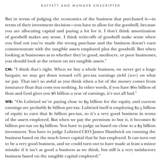 Here are two screen shots from the excellent book Buffett & Munger Unscripted by Alex Morris that show Warren Buffett explaining the difference between calculating returns both ways (keeping goodwill and intangibles in and taking them out) from the 2011 Berkshire Hathaway annual shareholder meeting: