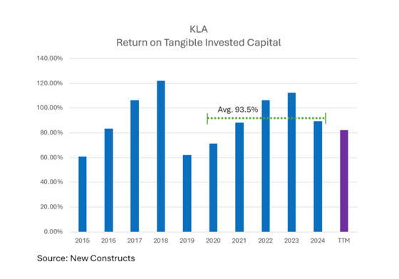 And below are the ROTIC charts from six additional holdings in the Bastion Industrial and Infrastructure portfolio (once again all of the numbers are coming from New Constructs). The lowest return business (of the six) is Eaton which generated five-year average ROTIC of 20%, but notice that Eaton’s ROTIC increased for four consecutive years (2020 though 2024) and its TTM ROTIC is still way above its five-year average. The highest return business (of this group of six) is KLA Corp with five-year average ROTIC of a whopping 93.5%.